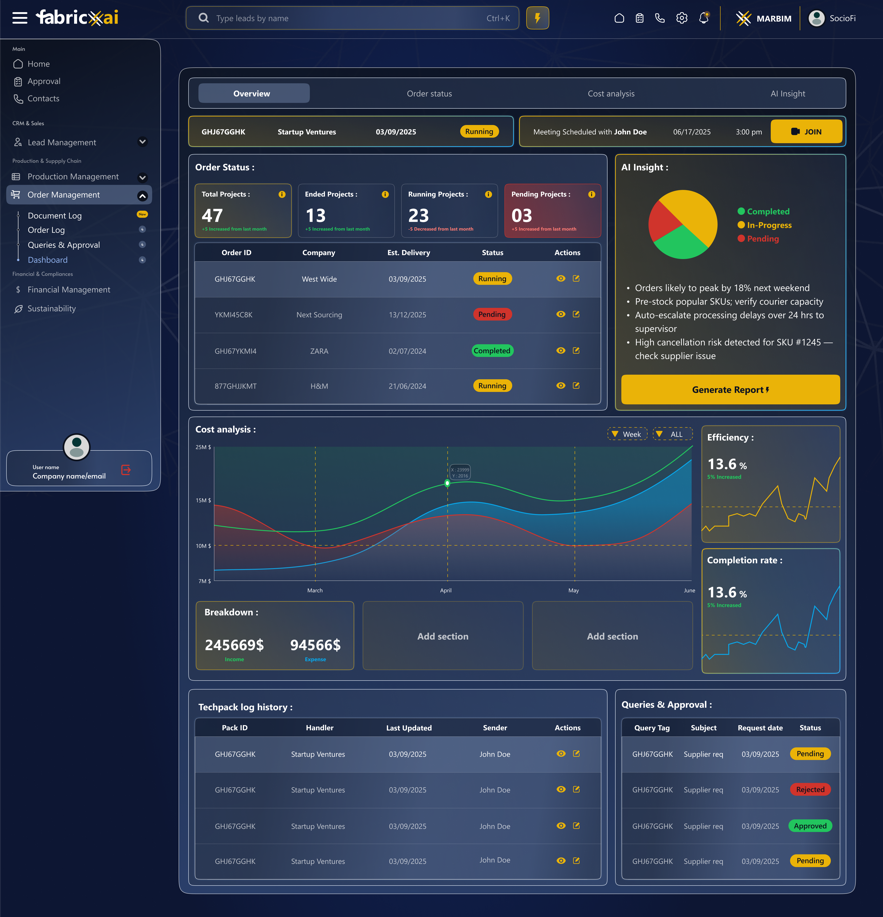 fabricXai combines elements of CRM, ERP, and AI analytics specifically adapted to the workflows of textile/garment manufacturing.
