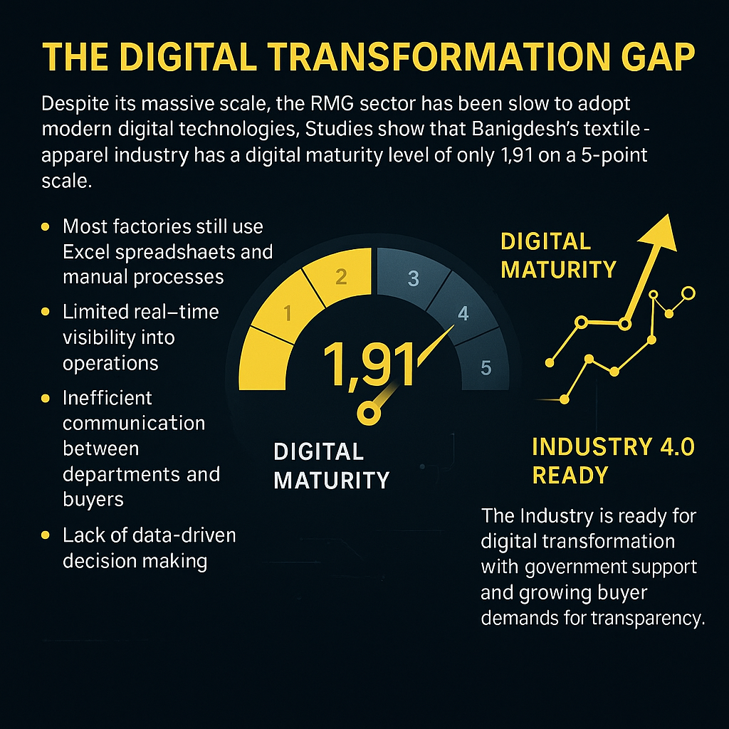 Despite its massive scale, the RMG sector has been slow to adopt modern digital technologies. Studies show that Bangladesh's textile-apparel industry has a digital maturity level of only 1.91 on a 5-point scale.
